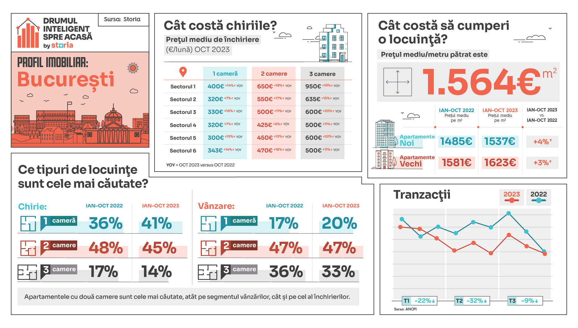 Storia, platforma de imobiliare lansată de OLX, a publicat datele celei mai recente analize „Profil imobiliar: București”. Conform analizei, prețul mediu de vânzare solicitat pe metru pătrat în București, în perioada ianuarie-octombrie 2023, a ajuns la 1.564 euro, iar cele mai căutate tipuri de apartamente au fost cele cu două camere, atât pe segmentul vânzărilor, cât și pe cel al închirierilor.   Cele mai populare tipuri de locuințe din București, în primele 10 luni ale anului 2023   În București, cele mai căutate apartamente pentru închiriere și vânzare, în perioada ianuarie-octombrie 2023, au fost apartamentele cu două camere.   Pe segmentul vânzărilor, pe primul loc în topul căutărilor se află apartamentele cu două camere (47%), urmate de apartamentele cu trei camere (33%) și abia apoi de garsoniere (20%). Comparativ cu aceeași perioadă a anului trecut (ianuarie-octombrie 2022), a crescut interesul față de garsoniere (+23%), dar și față de apartamentele cu două camere (+4%). În schimb, s-au înregistrat scăderi în ceea ce privește interesul pentru apartamentele cu trei camere (-3%).   În ceea ce privește segmentul închirierilor, apartamentele cu două camere (45%) s-au aflat în topul căutărilor și au fost urmate de garsoniere (41%) și de apartamentele cu trei camere (14%). Față de aceeași perioadă a anului trecut, pe platformă s-au înregistrat cu 20% mai multe căutări pentru garsoniere, în timp ce căutările pentru apartamentele cu două camere (-1%) și cele cu trei camere (-11%) au scăzut.   Cât costă cumpărarea sau închirierea unei proprietăți în București?   În perioada ianuarie-octombrie 2023, prețul mediu de vânzare solicitat pe metru pătrat a ajuns la 1.564 euro în București.   În luna octombrie 2023, apartamentele noi de vânzare au avut un preț mediu pe metru pătrat de 1.556 de euro, ușor mai mare față de cel din octombrie 2022.  În schimb, apartamentele vechi au avut un preț de vânzare de 1.733 de euro/metru pătrat.   În ceea ce privește prețurile apartamentelor de închiriat, acestea au crescut în luna octombrie a.c. pe toate categoriile de locuințe. Așadar, în luna octombrie 2023, românii au putut închiria o garsonieră în București cu un preț mediu de 334 euro, în creștere cu 11% față de anul trecut. Apartamentele cu două camere au avut un preț mediu de 524 de euro în octombrie a.c, în creștere cu 16% față de luna octombrie a anului trecut. De asemenea, apartamentele cu trei camere s-au închiriat în luna octombrie 2023 cu un preț mediu de 683 de euro, cu 18% mai mare față de anul trecut.   „Am observat o schimbare vizibilă în preferințele românilor. Aceștia s-au orientat tot mai mult către proprietăți mai mici, cu un accent deosebit pe eficiența spațiului și costurile de întreținere reduse. Această schimbare reflectă nu doar o adaptare la cerințele pieței, ci și o dorință de a găsi soluții locative echilibrate și arată, totodată, o ajustare naturală și echilibrată a pieței imobiliare. Observăm că piața imobiliară revine la nivelul de interes din 2022, un an record, cu o discrepanță din ce în ce mai mică între numărul de tranzacții imobiliare înregistrate în 2023 comparativ cu anul precedent”, a declarat Răzvan Ceapă, Head of Operations Storia şi OLX Imobiliare.   Totalul tranzacțiilor de unități individuale efectuate în București de la începutul anului respectă tendințele de la nivel național, fiind în scădere în fiecare trimestru, comparativ cu perioada similară a anului trecut. Se observă o revenire în ceea ce privește numărul tranzacțiilor din trimestrul al treilea (iulie-septembrie 2023 vs. 2022), scăderea fiind de doar -9%. În trimestrul al doilea (aprilie-iunie 2023 vs. 2022) scăderea a fost de 32%, iar în primul trimestru (ianuarie-martie 2023 vs 2022) scăderea a fost de 22%. În plus, și în cazul tranzacțiilor efectuate cu credit se observă o revenire, acestea fiind în creștere (+1%) în trimestrul al treilea (iulie-septembrie 2023 vs. 2022).   Cu privire la tranzacțiile de pe Storia, dacă în 2022 46% din tranzacțiile de pe Storia erau pentru apartamente și case de închiriat, în anul 2023 cifra a crescut la 48%. De la începutul anului, cele mai multe tranzacții de pe Storia au fost efectuate cu scopul vânzării (52%) versus 48% în scop de închiriere. Analiza a fost realizată de Storia – platforma de imobiliare lansată de OLX, ca parte din inițiativa „Drumul inteligent spre acasă”, prin care brandul își propune să contribuie la transparentizarea informațiilor necesare tuturor cumpărătorilor, chiriașilor, proprietarilor, agenților și dezvoltatorilor, cu scopul de a-i susține să ia decizii imobiliare corecte, în cunoștință de cauză.