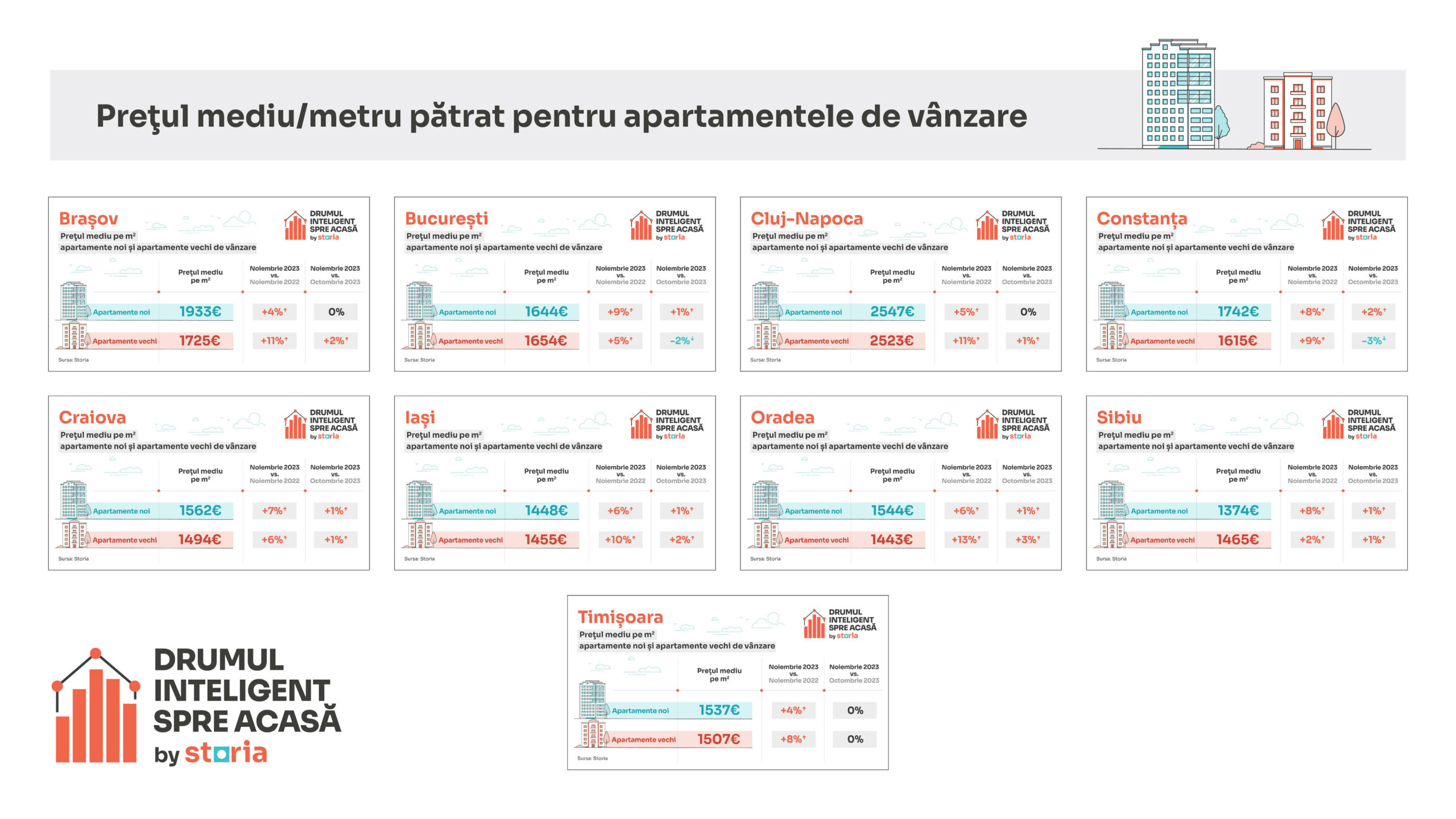 „În luna noiembrie am remarcat o creștere a solicitărilor de achiziții imobiliare și o accelerare a procesului de tranzacționare, fenomen direct influențat de noile măsuri fiscale care urmează să intre în vigoare din 2024. Chiar dacă, în general, cererea este mai mică în noiembrie, anul acesta am observat o creștere semnificativă atât din perspectiva cererii, cât și la capitolul costurilor apartamentelor de vânzare. Acest fapt reflectă adaptarea rapidă a pieței la modificările fiscale anticipate și intensificarea interesului pentru achizițiile imobiliare înainte de implementarea noilor măsuri fiscale din 2024”, a declarat Răzvan Ceapă, Head of Operations Storia & OLX Imobiliare”, a declarat Răzvan Ceapă, Head of Operations Storia & OLX Imobiliare.