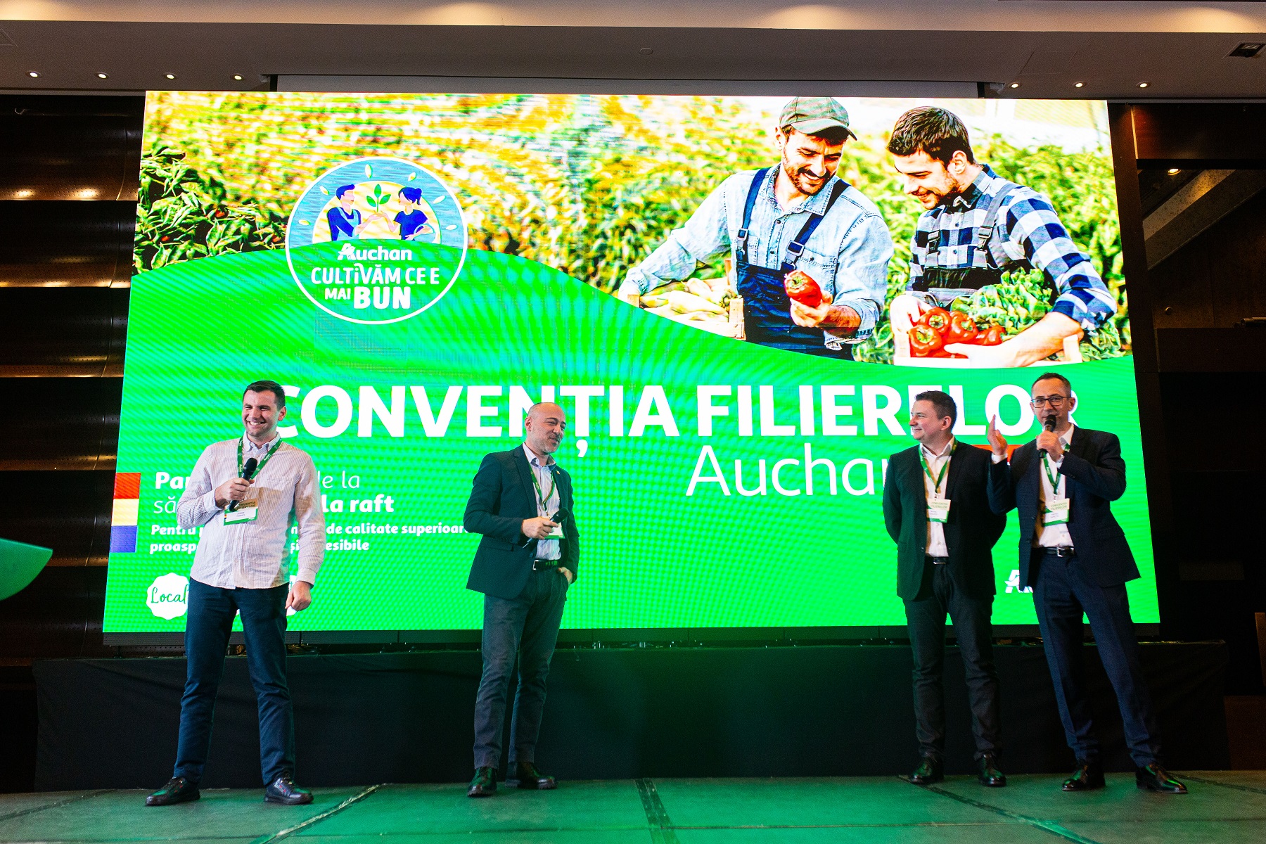 Evenimentul a continuat cu o prezentare asupra componentei de calitate a produselor de filieră și despre modul în care se realizează auditurile necesare și ce înseamnă procesul de trasabilitate controlată de către Auchan. Nu în ultimul rând, retailerul a adresat producătorilor prezenți și un mesaj important cu privire la decarbonizare și la ce tip de acțiuni se pot adopta astfel încât amprenta asupra mediului și amprenta de carbon să fie reduse. O serie de invitați speciali, respectiv producători care sunt deja furnizori pentru filiere Auchan, au urcat pe scenă pentru a împărtăși experiența de lucru, povestea lor și beneficiile de care se bucură în calitate de furnizor de filieră Auchan.