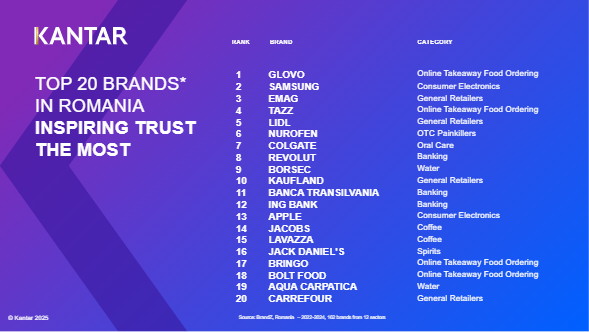 Kantar România a lansat, în cadrul evenimentului dedicat clienților “Factorul Încredere – Cum traversează brandurile puternice vremurile incerte”, topul celor 20 de branduri care au reușit să inspire cea mai mare încredere consumatorilor români, pe baza analizei a 162 de mărci din 12 sectoare*. Într-o perioadă marcată de incertitudine și scepticism, încrederea devine elementul esențial în relația dintre branduri și consumatori. TOPUL ÎNCREDERII: GLOVO LIDER În cadrul evenimentului denumit Factorul Încredere - Cum traversează brandurile puternice vremurile incerte, Kantar România a prezentat topul celor mai de încredere 20 de branduri potrivit percepțiilor consumatorilor. Kantar BrandZ România - Clasamentul primelor 20 de branduri* în funcție de încrederea pe care o inspiră în consumatorilor români, branduri măsurate în perioada 2022-2024 Glovo s-a clasat pe primul loc, înregistrând cel mai mare index al încrederii (146) dintre toate cele 162 de mărci evaluate până acum de BrandZ în România, semnificativ peste media pieței (100). Analiza clasamentului Top 20 relevă câteva tendințe cheie în preferințele românilor:  Dominația platformelor de livrare și a retailerilor: prezența masivă a acestora subliniază cât de mult apreciază românii confortul (convenience) și brandurile care le simplifică viața.  Performeri din sectoare cu încredere scăzută în general: chiar și în categorii provocatoare precum OTC-urile sau băuturile spirtoase, branduri ca Nurofen și Jack Daniel’s reușesc să câștige încrederea consumatorilor.  Puterea brandurilor globale de calitate: mărci consacrate precum Samsung se regăsesc în top, confirmând importanța calității percepute.  Succesul brandurilor locale: Borsec și eMAG demonstrează că mărcile autohtone cu istorie și reputație solidă pot construi o relație de încredere puternică.  Inovația în sectorul bancar: soluții inovatoare precum Revolut își câștigă locul alături de băncile tradiționale, recunoscute pentru integritate. La polul opus, sectoarele utilităților și îngrijirii părului nu au avut reprezentanți în topul încrederii. Ipoteze pentru potențiale barierele ale încrederii:  Utilități: Incertitudinea generată de liberalizare, discuțiile despre plafonare și prețuri, alături de complexitatea serviciilor.  Îngrijirea părului: Numărul mare de opțiuni, comunicarea ce idealizează rezultatele, eficacitatea variabilă și cererea crescândă pentru ingrediente naturale. PROVOCARILE EREI POST-ADEVĂRULUI: CONTEXTUL STUDIULUI Evenimentul a debutat cu o analiză a contextului actual, realizată de Carmen Pătrașcu, Managing Director Kantar România. Aceasta a subliniat provocările unei lumi dominate de dezinformare și scepticism: trăim într-o lume în care poveștile fabricate se răspândesc rapid, alimentate de algoritmi și propriile noastre prejudecăți. Imagini manipulate, știri false țesute cu măiestrie – erodează încrederea, produc diviziune și ne fac să punem totul la îndoială. “Bine ați venit în era post-adevărului ! O lume în care, cel mai adesea, credința cântărește mai mult decât dovezile. Când oamenii se luptă să distingă realitatea de ficțiune, când nu au acces la informații științifice clare și ușor de înțeles, frica poate prinde rădăcini. Acest scepticism față de știință manifestat de români (n.r. conform ultimului Eurobarometru românii se îndoiesc cel mai mult de știință) împiedică progresul. Poate avea un impact asupra deciziilor pe care oamenii le iau de ex. în privința propriei lor sănătăți, el poate înăbuși inovația și adoptarea de produse noi.” În fața acestui tablou îngrijorător, Carmen a lansat și o provocare pentru audiență: „Într-o epocă în care faptele obiective și adevărul au o influență mai mică asupra formării opiniei publice, mai mică decât apelurile emoționale și credințele personale sau de grup – apare așadar tot mai mult aceasta întrebare: cum construim încrederea?​” MODELUL '3i': CUM SE CONSTRUIEȘTE ȘI SE MĂSOARĂ ÎNCREDEREA Mary Kyriakidi, Global Thought Leader la Kantar și invitată specială a evenimentului, a prezentat modelul „3i” ca instrument de construire a încrederii: 1. Integritate: a face ceea ce promiți și a oferi compensații adecvate atunci când apar probleme. 2. Identificare: stabilirea unei conexiuni la nivel uman, emoțional – esențială în vremuri incerte, când oamenii se bazează mai mult pe emoții. 3. Incluziune: a face consumatorul să se simtă parte a comunității brandului, egal și valorizat, activând sentimentul primordial de încredere în grup. “Căldura și entuziasmul din sală au ajutat din plin să aducem la viață cei 3"i" ai modelului Brand Trust pe care îl folosim în Kantar. Ne-au reamintit tuturor foarte clar că încrederea nu este doar un concept abstract și teoretic; este ceva profund uman. Când vorbim despre integritate, identificare și incluziune, ne referim chiar la acest gen de conexiuni autentice, realizate într-un mediu receptiv, precum cele pe care le-am experimentat împreună cu participanții la eveniment, pe parcursul întregii sesiuni. Acest tip de legături subliniază cât de vitale sunt aceste elemente, nu doar pentru mărci pentru a se conecta cu consumatorii, ci și pentru noi, experții în marketing, ca să ne conectăm unii cu alții în jurul provocărilor și a perspectivelor comune.”, a declarat Mary Kyriakidi, subliniind rezonanța modelului cu experiența participanților la eveniment. NIVELUL DE ÎNCREDERE ÎN ROMÂNIA ȘI IMPACTUL ASUPRA DECIZIEI DE CUMPĂRARE Studiul global BrandZ de la Kantar arată că încrederea este greu de câștigat: doar 1 din 4 consumatori la nivel mondial declară că are încredere în mărci. "Deși acest nivel de încredere poate părea modest, el ne spune o p