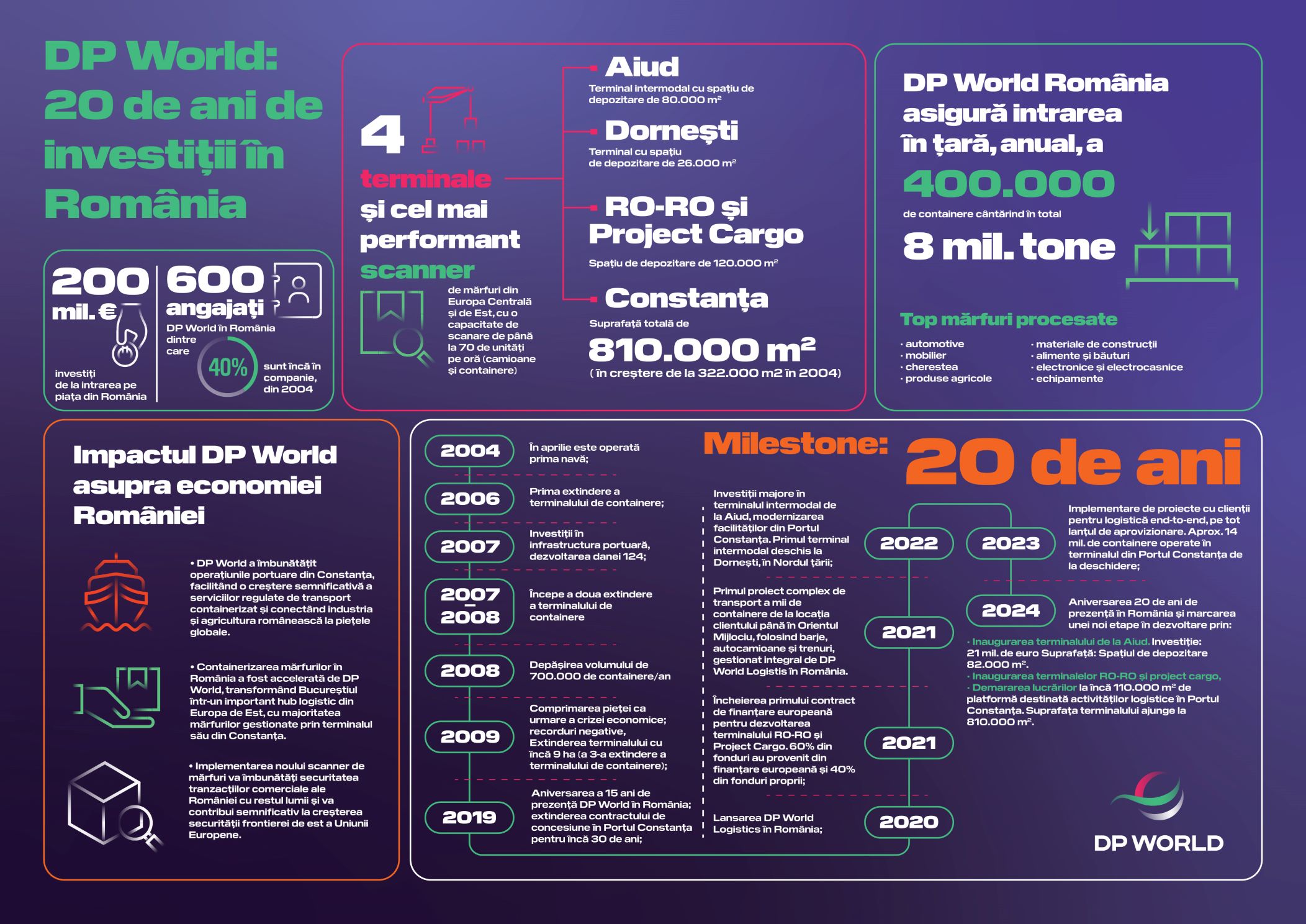 DP World a anunțat astăzi deschiderea a trei noi locații majore în România, oferind un impuls semnificativ în consolidarea poziției țării drept centru cheie al comerțului european și facilitând astfel creșterea economică în întreaga regiune. Constanța, cel mai mare port de containere de la Marea Neagră, găzduiește acum două noi facilități în urma unei investiții de 65 milioane de euro: un terminal cargo de 5 hectare pentru mărfuri grele, voluminoase și complexe și un nou terminal „roll-on, roll-off” (RO-RO) care va gestiona până la 80.000 de vehicule pe an în perioadele de vârf. Încă 50 de milioane de euro vor fi investite într-o nouă platformă multi-transport în Constanța, care se va deschide în 2025. A treia unitate nou lansată a DP World se află la Aiud, în inima industrială a României, care acum găzduiește un nou hub logistic intermodal de 8 hectare ce leagă transportul rutier cu cel feroviar, în urma unei investiții de 21 de milioane de euro. Noile facilități vor îmbunătăți conectivitatea dintre serviciile existente de transport maritim, feroviar, pe barje și rutier ale DP World în toată România și vor îmbunătăți circulația mărfurilor între Europa continentală și Marea Neagră, Marea Nordului și Marea Adriatică. DP World a investit peste 250 de milioane de euro în România, începând din 2004, suma incluzând și granturi din partea Uniunii Europene. Cele mai recente proiecte ale DP World au fost anunțate cu prilejul aniversării a 20 de ani de prezență în România, prima ţară europeană în care compania s-a extins. În această perioadă, DP World și-a majorat considerabil operațiunile, contribuind la creșterea impresionantă a portului. În intervalul de 20 de ani, și România s-a dezvoltat rapid și este acum a doua economie ca mărime a Europei de Est, după Polonia. DP World anticipează că cele mai recente investiții vor permite și vor încuraja marile companii să își mute sau să își extindă unitățile de producție din regiune. Conceptele de nearshoring și reshoring au devenit din ce în ce mai răspândite în Europa, în ultimii ani, pe măsură ce tensiunile geopolitice s-au intensificat. Un exemplu de nearshoring și reshoring poate fi văzut în industria automotive, care a crescut rapid în ultimii ani în regiune și este de așteptat să crească în continuare. Piața automotive reprezintă deja 13% din PIB-ul României, Mercedes-Benz, Dacia, deținută de Renault, și Ford operând deja unități de producție locale. De asemenea, companiile din industria auto investesc din ce în ce mai mult în țările din vecinătate, precum Ungaria, Polonia și Turcia. Acest aspect face ca lanțurile de aprovizionare robuste și infrastructura logistică, așa cum este cazul terminalului RO-RO, să devină din ce în ce mai esențiale nu doar pentru România, ci și pentru regiune. Rashid Abdulla, CEO și Managing Director, DP World Europe, care și-a început cariera în poziția de Manager al DP World România în 2004, a declarat: „România este o economie dinamică și bine poziționată pentru a beneficia de creșterea sectorului nearshoring și a producției. DP World așteaptă cu nerăbdare să își consolideze prezența pe plan local și să implementeze noile investiții pentru a sprijini România, deoarece aceasta joacă un rol tot mai important în comerțul și creșterea economică din regiune”. Cosmin Cârstea, CEO DP World România a afirmat, de asemenea: „Cele mai recente investiții ale DP World în România vor crește fluxurile de marfă din țară cu aproximativ două milioane de tone pe an. Credem că, prin această investiție, DP World Constanța își va consolida semnificativ poziția de unul dintre cele mai importante hub-uri de containere și RO-RO din Europa Centrală și de Est, asigurând cea mai mare parte a comerțului UE cu Turcia și Asia Centrală. Pentru a ajuta acest lucru, intenționăm să deschidem și un centru de excelență pentru servicii în Balcani, facilitând comerțul pentru țările din jurul României”. Sorin Grindeanu, Ministrul Transporturilor în România, a adăugat: „Guvernul României salută cea mai recentă investiție a DP World în infrastructura logistică a României. DP World este un partener puternic al României, de douăzeci de ani. Portul Constanța a deschis România către noi piețe și oportunități comerciale, a oferit locuri de muncă stabile și calificate și a catalizat dezvoltarea unei serii de business-uri adiacente”. Noile facilități ale DP World din România sunt cele mai recente dintr-o serie de noi investiții în toată Europa, deoarece compania urmărește să își dezvolte capacitățile adresate clienților care caută soluții mai rapide și mai rezistente pentru lanțul de aprovizionare. Alte investiții realizate în Europa în ultimii ani au inclus programe de extindere a porturilor în șase dintre cele 11 terminale majore de pe continent, inclusiv la Anvers (Belgia), Novi Sad (Serbia) și London Gateway (Marea Britanie). De asemenea, DP World se bazează pe activele sale și pe expertiza substanțială pentru a oferi o soluție de lanț de aprovizionare end-to-end, oferind partenerilor săi, dar și clienților acestora, soluții integrate, durabile și rezistente.