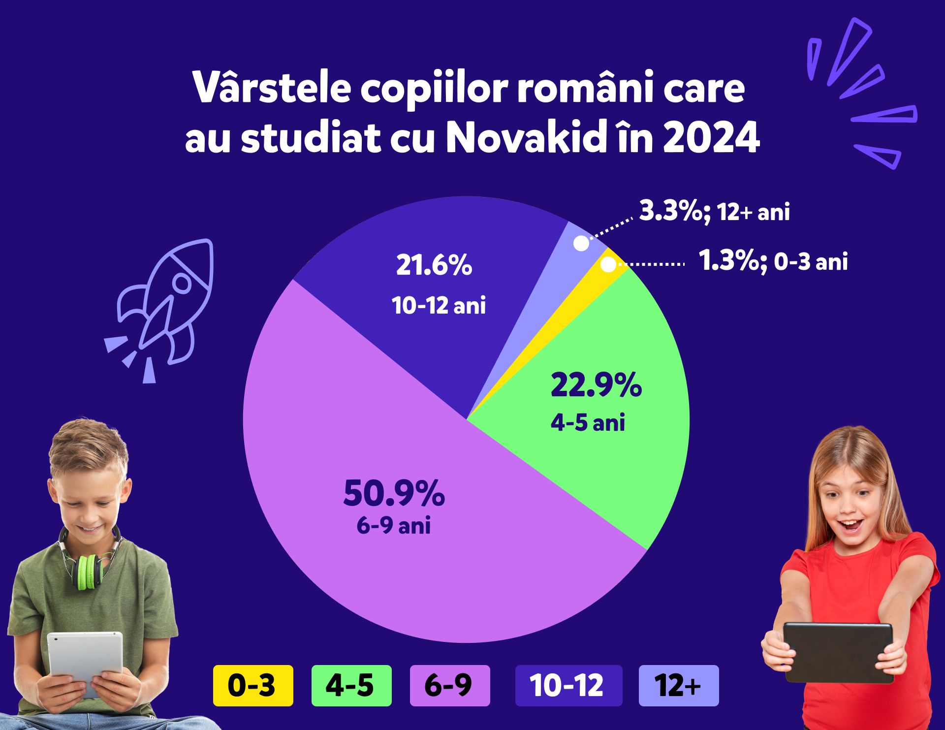 Novakid - scoala online de engleza ca a doua limba (ESL) pentru copii, detinatoare a numeroase distinctii internationale - s-a bucurat de o performanta notabila in 2024. In al optulea an de activitate in peste 50 de tari, a inregistrat o crestere de 23,5% la capitolul studenti noi (comparativ cu anul precedent), 36.226 dintre cursanti fiind romani. Compania a avut parte, de asemenea, de o crestere de 26% a veniturilor (comparativ cu anul precedent) si a achizitionat Lingumi, o platforma bazata pe inteligenta artificiala (AI), conceputa pentru a face invatarea limbii engleze accesibila si captivanta.