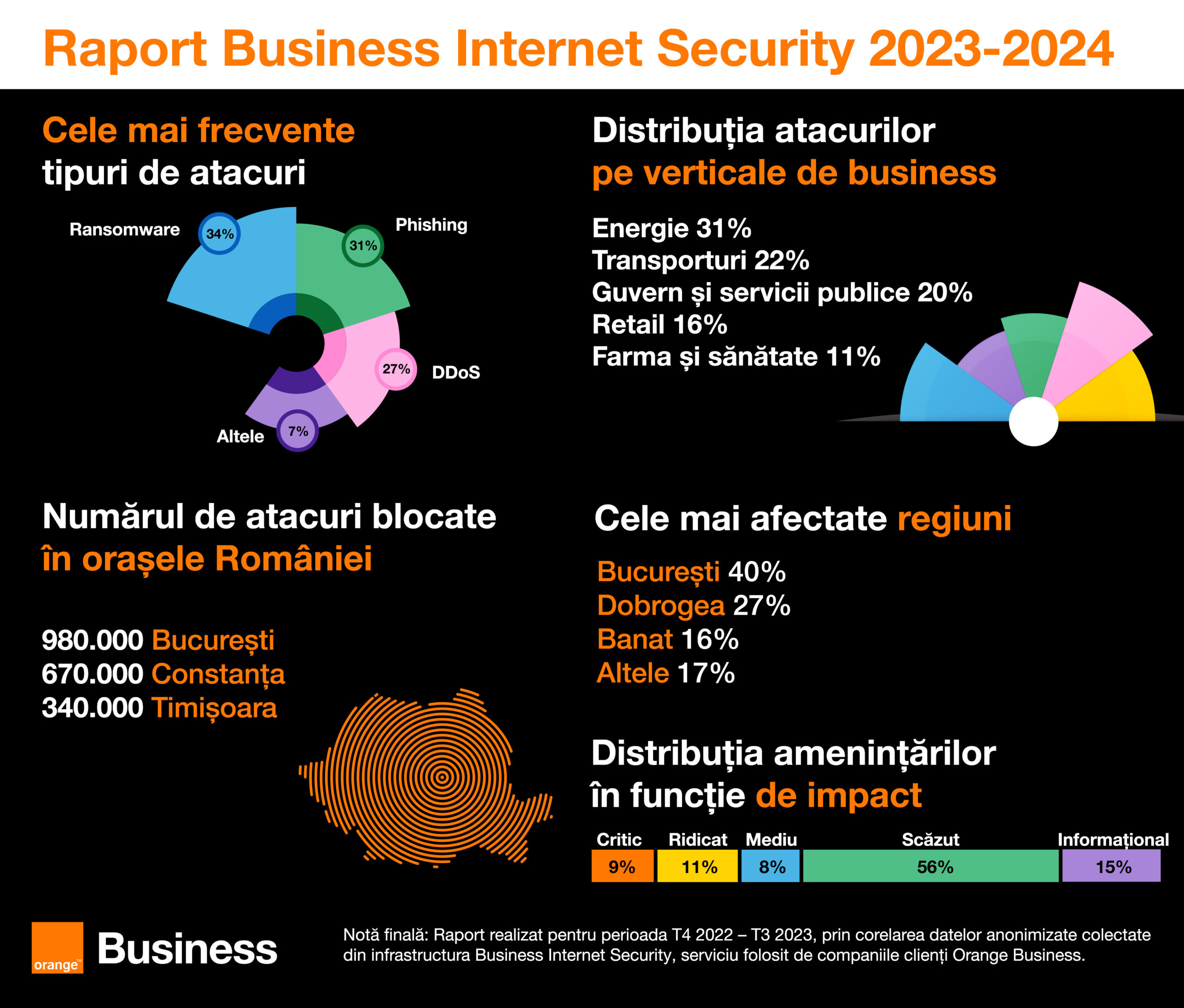 București, 23 noiembrie 2023. Orange Business lansează noul raport Business Internet Security 2023, ce oferă o imagine detaliată asupra provocărilor din domeniul securității cibernetice din ultimul an în contextul revoluțiilor tehnologice precum generative AI. Ajuns la a șasea ediție, noul raport pune la dispoziția experților din domeniu, dar și a mediului de afaceri deopotrivă, informații despre cele mai frecvente atacuri cibernetice întâmpinate la nivelul pieței locale, predicții pentru 2024, dar și soluții concrete furnizate de Orange Business pentru protecția companiilor și a administrațiilor publice. Distribuția atacurilor pe verticalele de business din România Conform raportului realizat de experții Orange Business ce au analizat peste 11 milioane de amenințări identificate lunar de serviciul Business Internet Security, a fost observată o creștere constantă a numărului de atacuri cibernetice. Analiza datelor din acest an a arătat că sectorul energetic a fost cel mai afectat, înregistrând 31% din totalul atacurilor, urmat de transporturi cu peste 22%, sectorul guvernamental și cel al serviciilor publice cu 19%, retail cu 19,7% și cel de sănătate cu peste 10%. Tipuri de amenințări cibernetice și distribuția lor pe regiuni 2023 a fost un an al ransomware-ului, continuând tendiță din anii anteriori, ce s-a manifestat printr-un număr crescut de atacuri care au afectat numeroase companii și au generat pierderi totalizând zeci de miliarde de USD. Datele analizate au arătat că atacurile de tip ransomware continuă să se propage atât prin vectori clasici precum e-mailuri, rețele sociale și descărcarea de fisiere din surse nesigure, cât și prin metode noi, precum atacurile inițiate din browser. Într-un top al celor mai răspândite tipuri de atacuri, pe primul loc se plasează ransomware-ul cu peste 34%, urmat de phishing cu 31% pentru al treilea an consecutiv, în timp ce pe locul 3 s-au aflat atacurile de tip DDoS ce au însumat 27% din totalul incidentelor. Din punct de vedere al distribuției la nivel național, cele mai multe atacuri au vizat regiunea București, aceasta însumând aproape 40% din totalul amenințărilor, urmată de regiunea de Sud-Est cu 27,13% și regiunea Banatului cu 16,27%. Astfel, Bucureștiul se află pe primul loc, cu o medie de 980.000 de atacuri prevenite în fiecare lună, urmat de Constanța cu o medie de 670.000 de atacuri lunar, in timp ce Timișoara se află pe locul trei cu aproape 340.000 de amenințări detectate și blocate în fiecare lună.