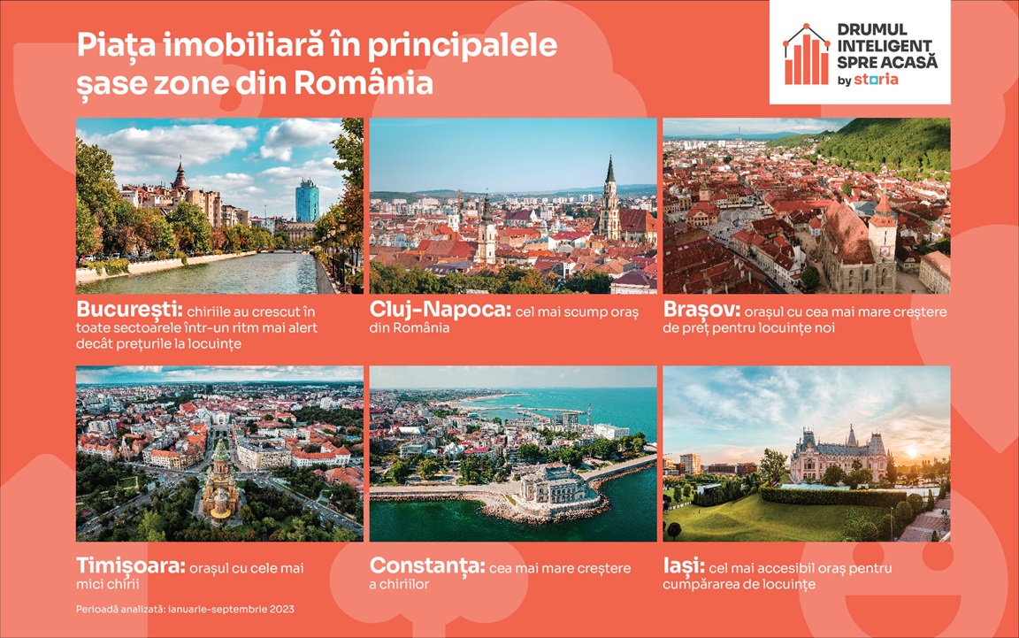 Cum au evoluat cele mai mari zone imobiliare din România în perioada ianuarie-septembrie 2023, pe baza anunțurilor publicate pe platforma imobiliară Storia: Brașovul a raportat cea mai mare creștere procentuală a prețurilor pentru locuințe noi, în timp ce Timișoara este orașul în care se găsesc cele mai mici chirii. Cluj-Napoca rămâne cel mai scump oraș al țării, mai ales că prețurile locuințelor au crescut cu aproape 8%, iar chiriile s-au majorat cu cel puțin 13%, potrivit celei mai recente analize realizate de Storia. Analiza face parte din inițiativa „Drumul inteligent spre acasă”, prin care brandul își propune să contribuie la transparentizarea informațiilor necesare tuturor cumpărătorilor, chiriașilor, proprietarilor, agenților și dezvoltatorilor, cu scopul de a-i susține să ia decizii în cunoștință de cauză.