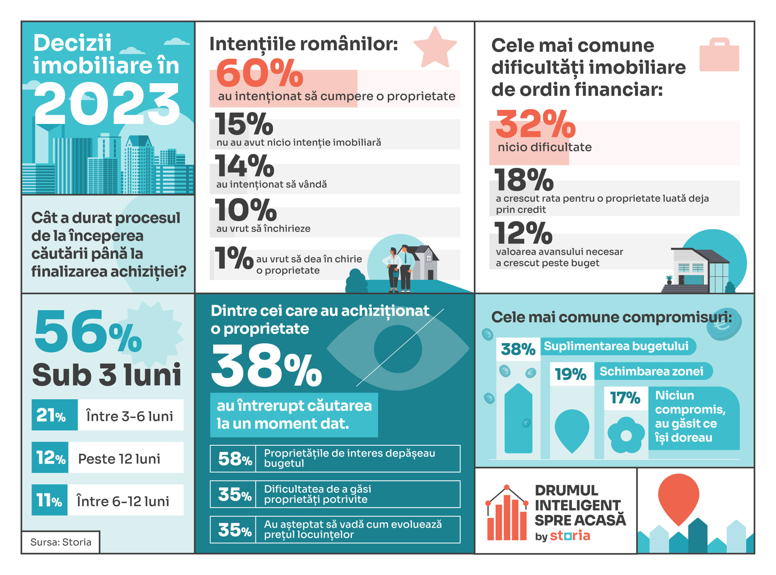 Datele arată că, în 2024, utilizatorii de pe platforma Storia își propun să vizualizeze anunțuri imobiliare (62% din totalul respondenților), iar 53% au declarat că vor să și vizioneze proprietățile de interes. În plus, o mare parte și-a propus să consulte un broker sau banca pentru opțiunile de creditare (35%). De asemenea, utilizatorii își propun să urmărească știrile relevante pentru domeniul imobiliar (24%), în timp ce 22% și-au propus să lucreze cu un agent imobiliar.
