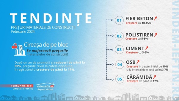De la fier beton și polistiren, până la ciment, OSB și panourile sandwich, toate materialele de construcții costă mai mult: fierul beton a crescut estimativ cu 10-15%, polistirenul s-a scumpit cu 5-8%, panourile sandwich cu 10%, iar cimentul, cu 3-5%. Prețul OSB-ului va crește progresiv, începând cu 10% in luna martie iar o lună mai târziu, cu încă 7%. Până și cărămida, care era disponibilă anul trecut cu reduceri substanțiale, după ce aceste promoții au încetat, a ajuns să coste cu până la 17% mai mult.